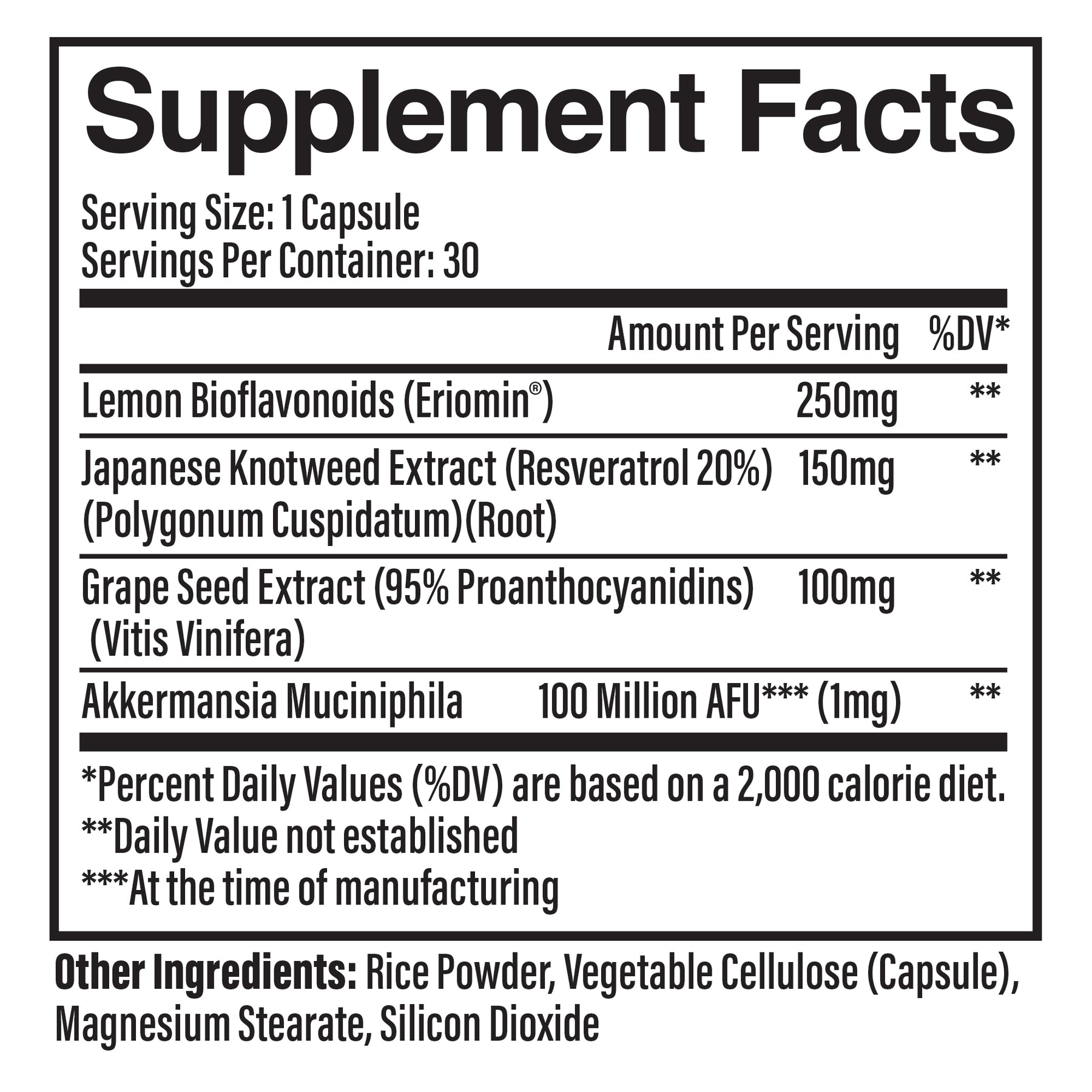 This formula contains four powerful ingredients: Eriocitrin, a lemon-derived polyphenol that supports GLP-1 activity; Resveratrol, which supports longevity and cellular health; Grape Seed Extract, which nourishes beneficial gut bacteria; and Akkermansia muciniphila, a next-generation probiotic that supports gut integrity and metabolism.