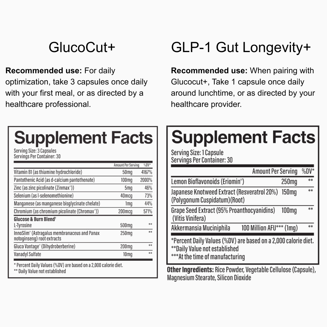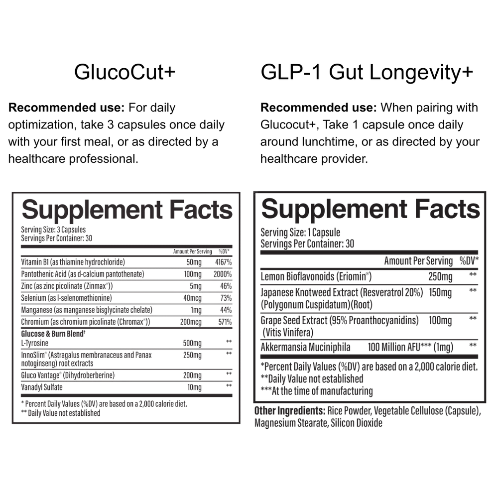 Take GlucoCut+ by taking three capsules once daily with your first meal.Take GLP-1 Gut Longevity+ by taking one capsule daily with your first meal or early afternoon. Consistency matters more than timing, so choose a routine you can maintain daily.